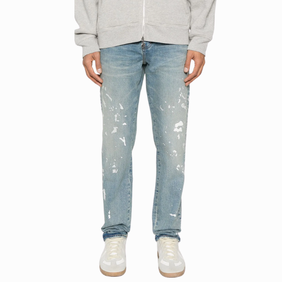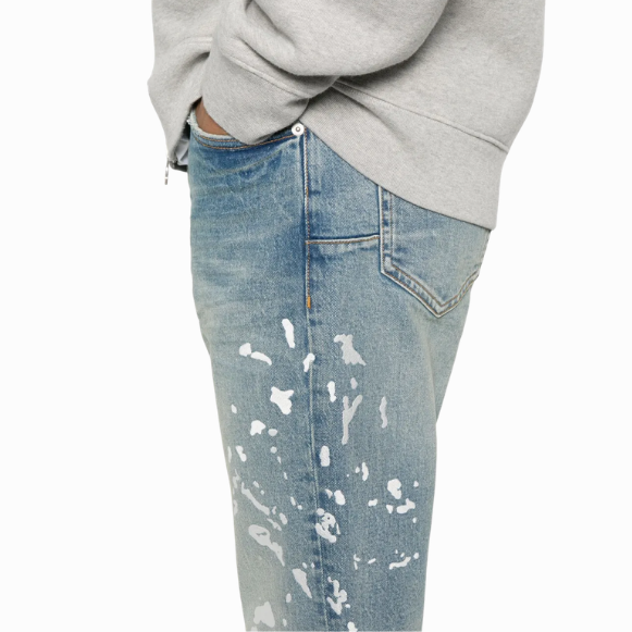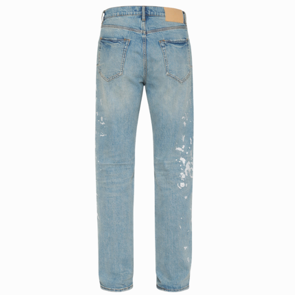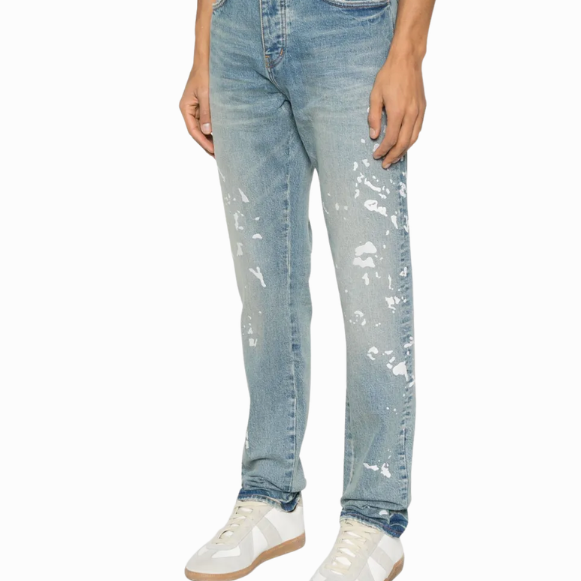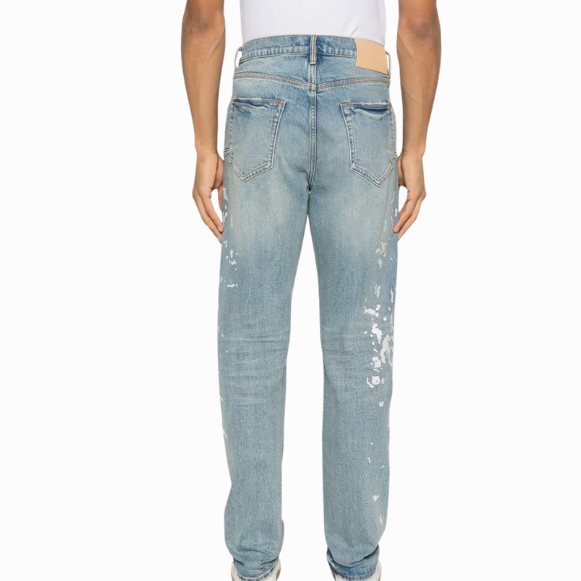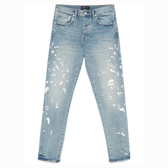 Estos pantalones parecen ser los pantalones vaqueros rectos con adornos de pedrería de la marca Purple Brand. Se caracterizan por un diseño de estrellas formadas por cristales o strass distribuidas por toda la prenda, sobre un denim de algodón elástico con un lavado índigo claro