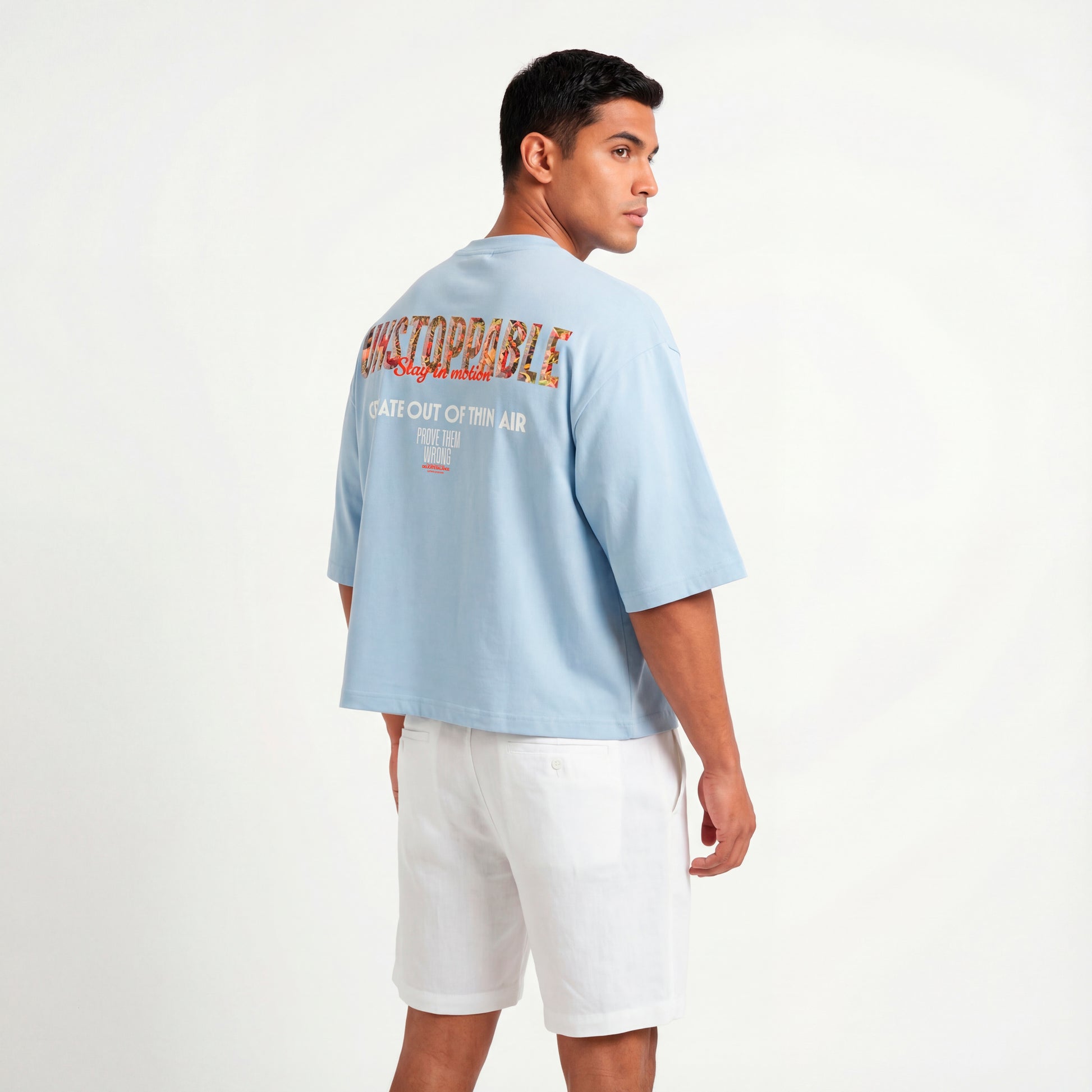camiseta de la marca Sassy Classy en color celeste. Sassy Classy es la marca griega que centra su visión en la creación de prendas de alta calidad con materiales de larga duración. Esta camiseta de corte boxy fit cuenta con un gráfico en la parte posterior con la palabra "Unstoppable" con un motivo a todo color. En la parte delantera el logotipo de la marca en formato minimalista con un cuadro de la imagen representativa de esta camiseta.